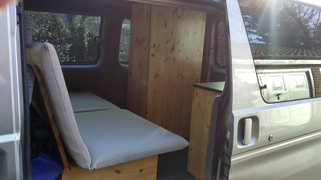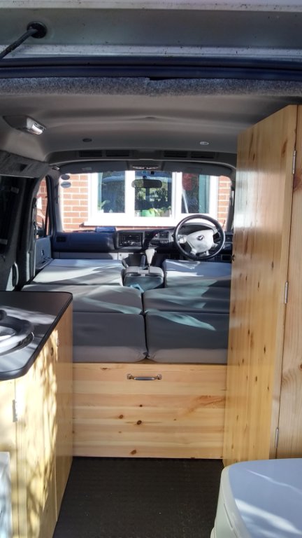 The cupboard door open on to the sink and does the job I could say that was my design genius but I would be lying ,I bought the mattress and worked from there to fit things in the conversions you can buy are very expensive and are MDF