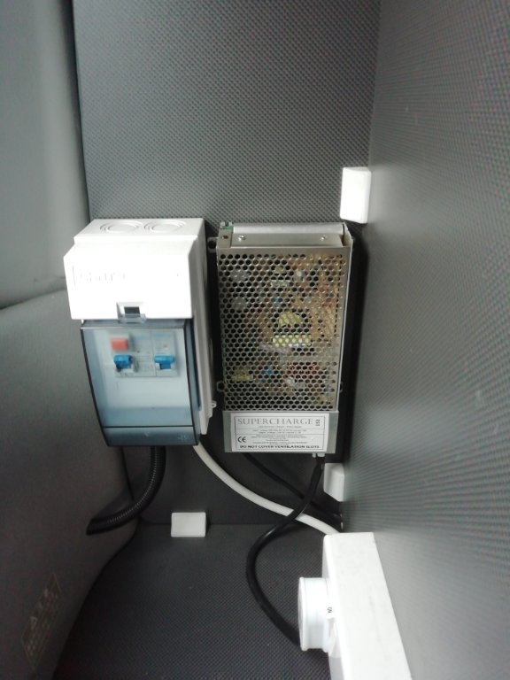 The power supply perforated metal box next to EHU RCD and switching feeds the panel as well and will run the items connected to it when Off and when a battery is selected will also work as a charger.