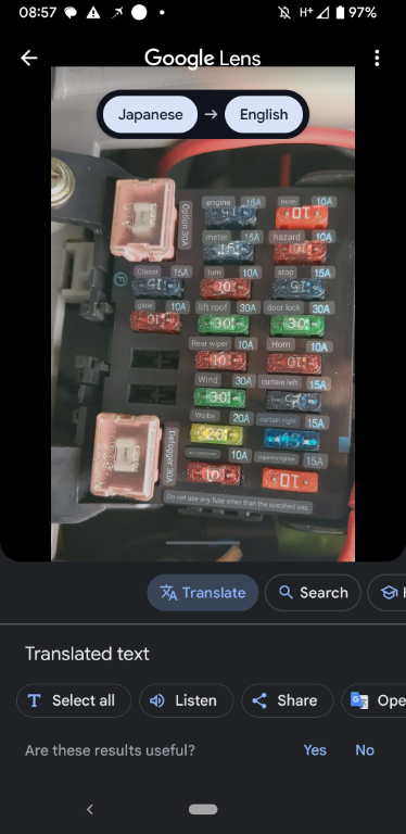 I now just need to work out which fuse slots the wire ends were in in the fuse board, I think because the fuses that the garage put in are slightly different I can work it out. I used Google translate (with the camera function) to translate the Japanese and looks like one was in "cigarette lighter" and one was in "room" (?) - would that make sense? I guess room could mean the back cabin?