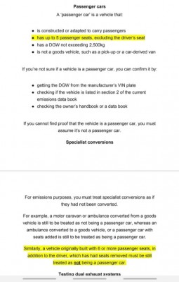 I did try to upload it but failed so put it in dropbox, basically passenger cars have up to 5 passenger seats, but a vehicle originally built with 6 or more passenger seats, in addition to the driver, which has had seats removed must be still treated as not being a passenger car so subject to a non cat test.