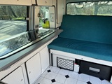 The engine is situated mid-vehicle, so neither the driver or passenger seats will swivel, although after-market swivel seats are available. In a standard configuration, there is a 3-person bench seat in the middle of the van, and a further 3 person bench seat at the rear. This rear bench is either on a sliding rail, or will split in two and will swivel up to hook on to the side of the van.