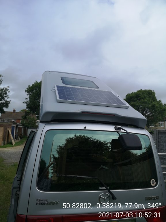 Coming along nicely. Solar panel fitted and cables inside, Dave Westgarth's awning brackets fitted, awning attached.