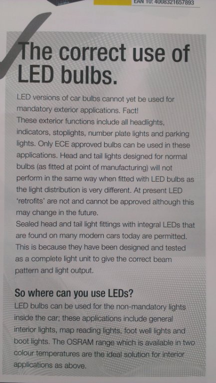 I'm not being a pedant but that may apply in the UK. I'm in Ireland and they aren't an NCT fail here so long as the direction and beam is alright. Happy to be corrected if wrong though. And, look, let's be honest here, LEDs for the reg light are hardly going to invalidate anything either way.