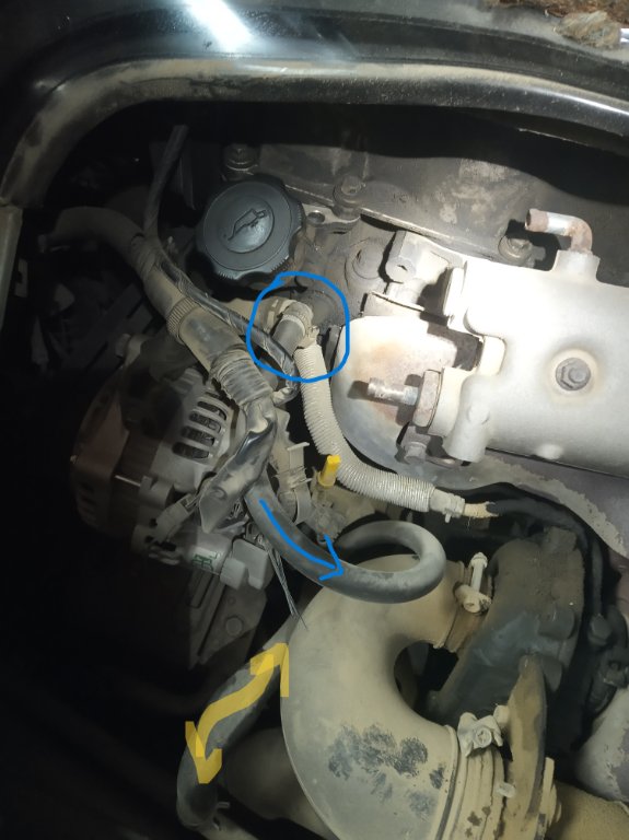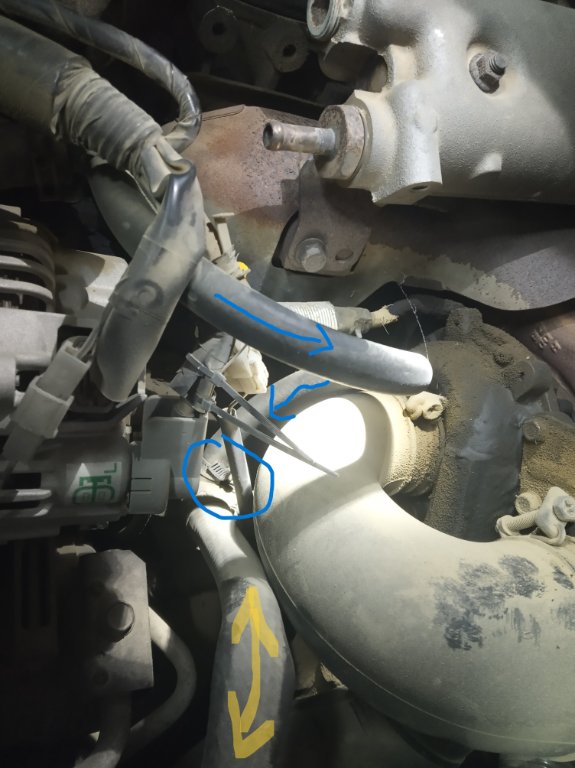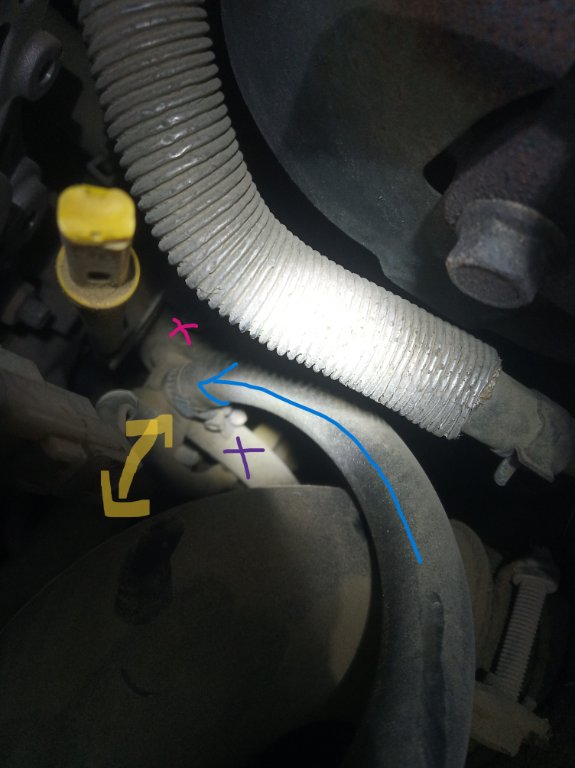 Looks like my former bleed pipe is now attached differently, maybe to the heater system(?) (blue arrow leading into yellow arrow) while the metal thing on the top right (marked orange) has been detached.