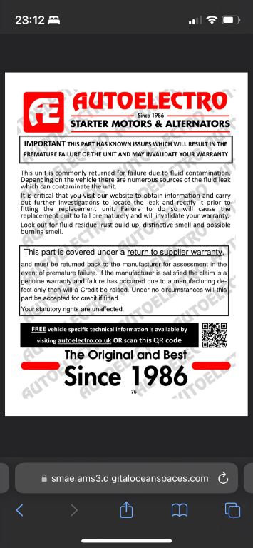 Whilst looking I found barely anything about this alternator or even many places stocking a replacement, but I did find a website that said there is a known fault with this alternator, I’ve attached a screenshot of this.