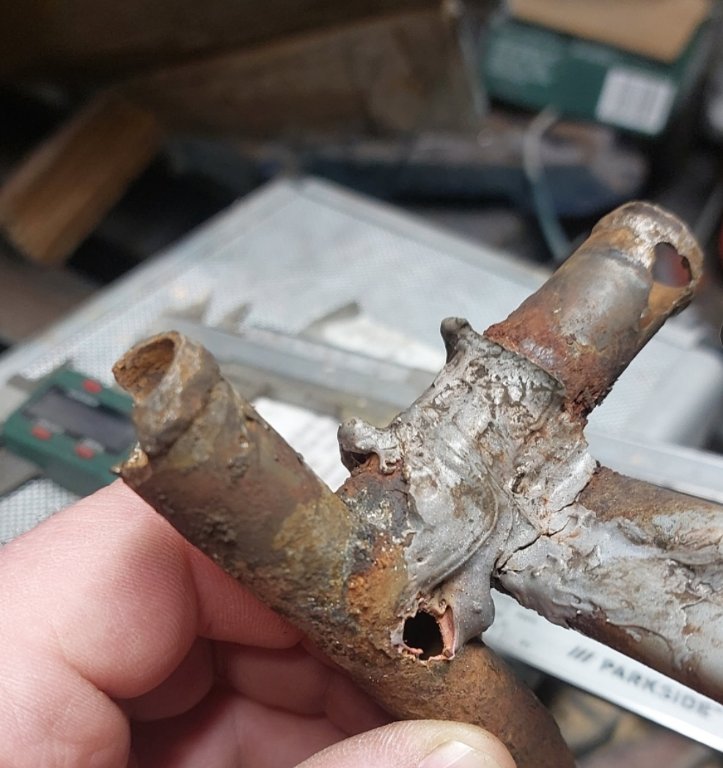 For the sake of interest, here is the rotten pipe that dropped all the coolant, complete with someone's lovely JB Weld bodge and the replacement I fabricated up.
