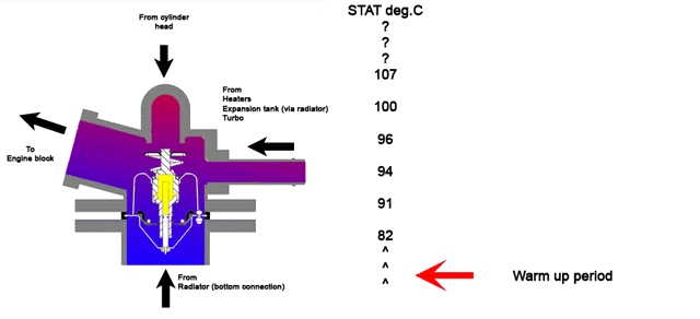 Surely you expect the pipe from the radiator to be cold ? Its the cross flow over the top of the thermostat that is the flow to be cooled down ? Click the image for animation ....