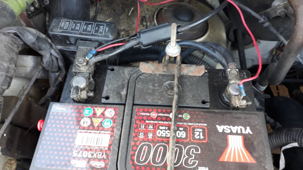 Thank you Bob and g8dhe - The van is "converted" in as much as the whole of the space behind front seats has been converted into a convertible bed/bench seats. There are no electric lights or input for electric. I used a tent type electrical set last week. The second battery was pointed out to me as a leisure battery. There are no switches with an engine logo. To the right of the steering wheel below the fog light switch is a flip switch and something with a red "light" presumably some sort of on/off or alarm. A leisure battery would be useful! Flipping the switch with engine on doesn't seem to do anything and the red light does not come on either way.
